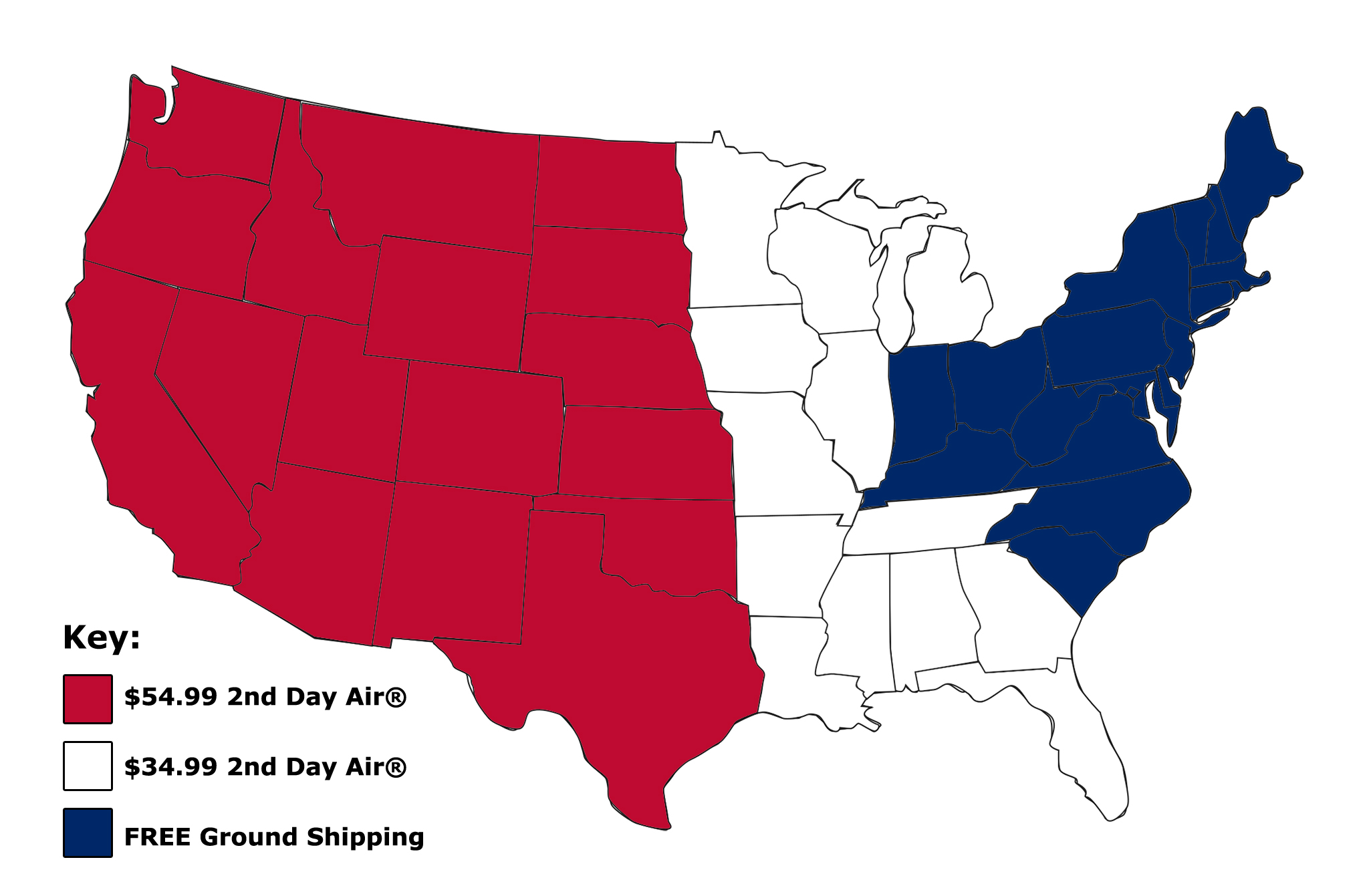 Flat rate of $54.99 on UPS 2nd Day AirĀ® shipping to the following states: Arizona, California, Colorado, Idaho, Kansas, Montana, Nebraska, New Mexico, Nevada, North Dakota, Oklahoma, Oregon, South Dakota, Texas, Utah, Washington and Wyoming